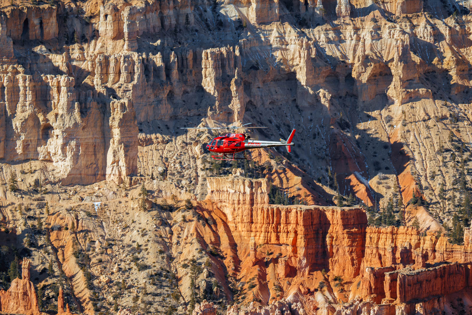 Bryce Canyon Helicopters launched as the only operator running helicopter tours over Bryce Canyon National Park, with three tour products spanning the introductory flight to the full park highlights tour. They brought me on for the full brand launch covering stills, video, web copy, and the visual kit that would carry the launch across every channel they were touching. We shot one day in February, air-to-air and ground positions both, in conditions that ran cold and windy enough to teach us something on the fly.